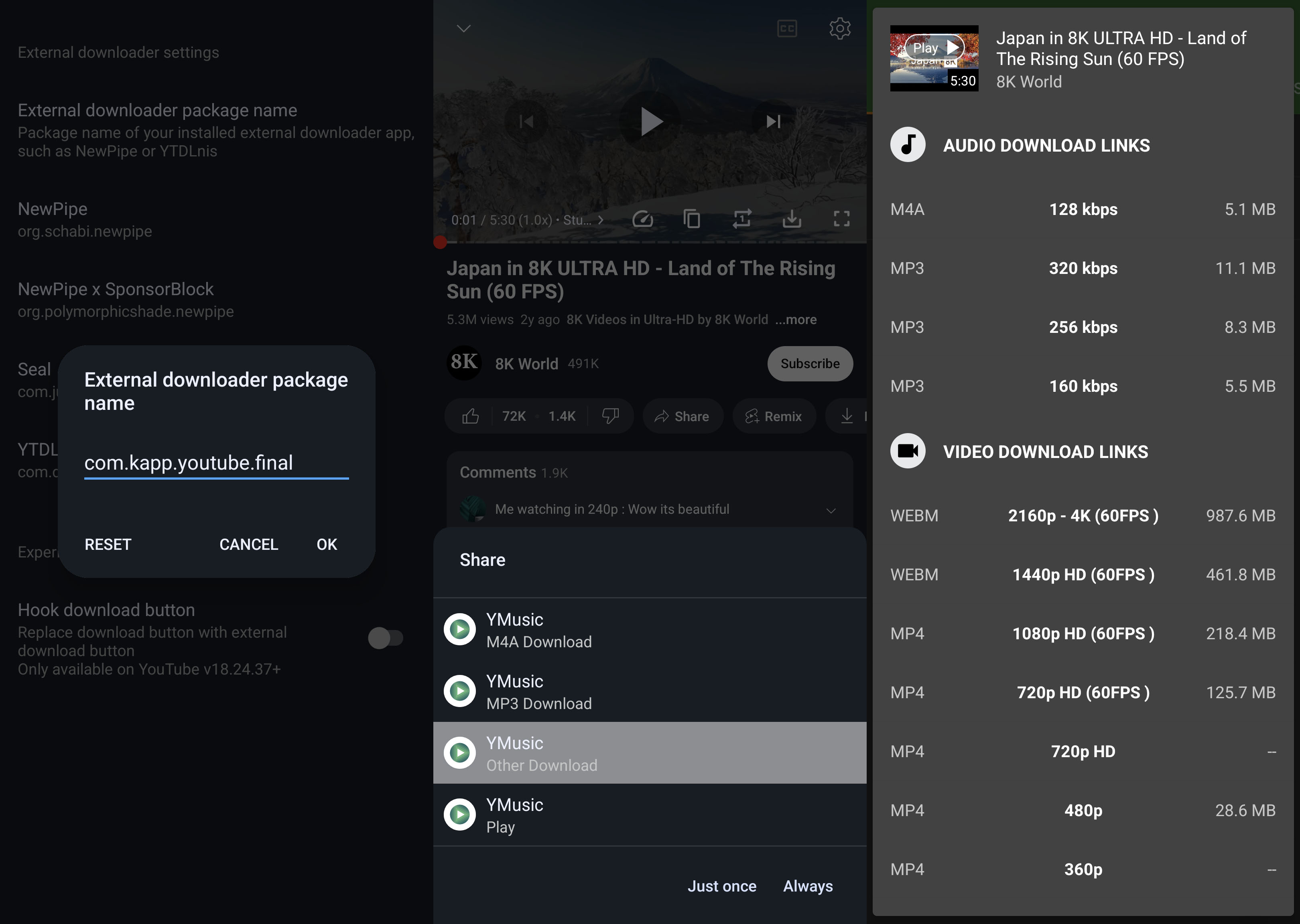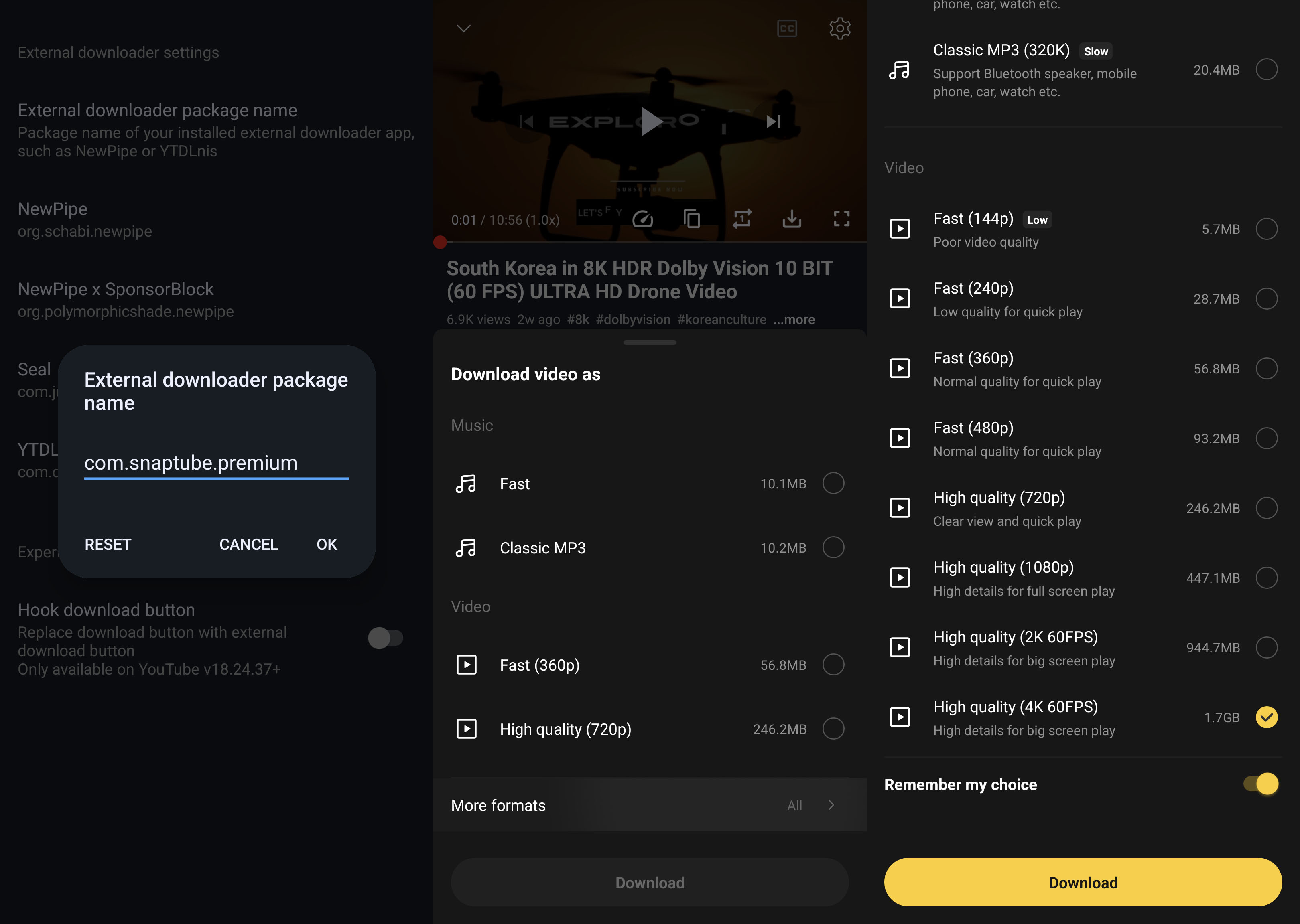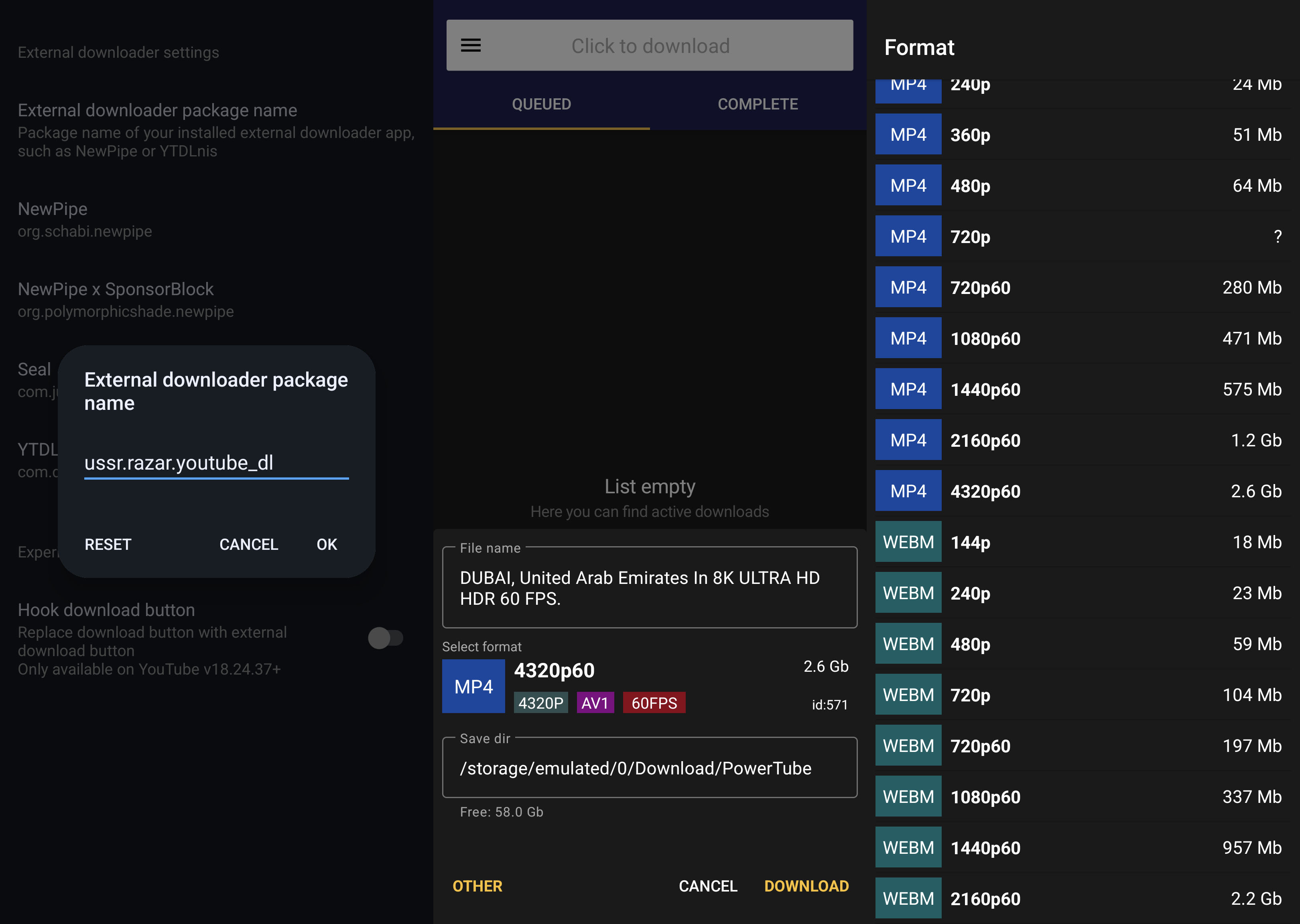 - Video downloads up to 4k60fps(haven't tested 8k) in 3 different formats - MPEG-4, WebM and 3GP(formats change depending on the quality)