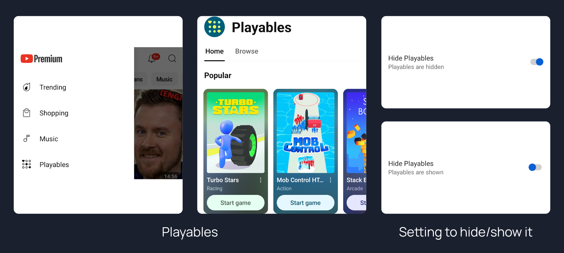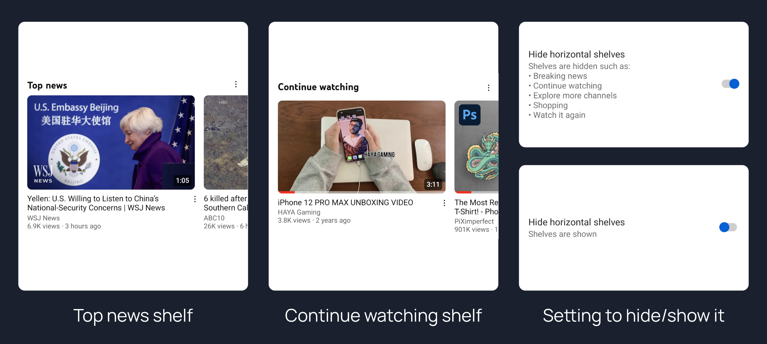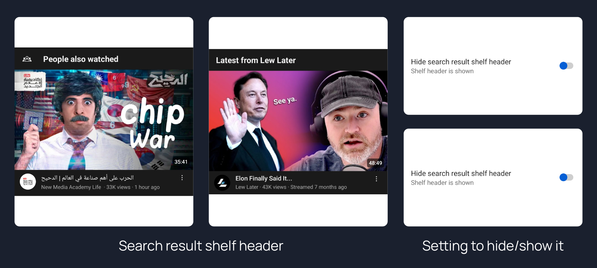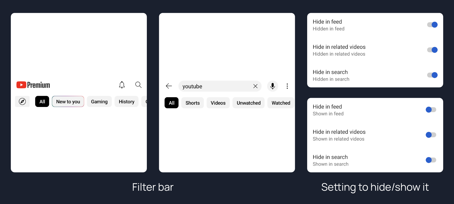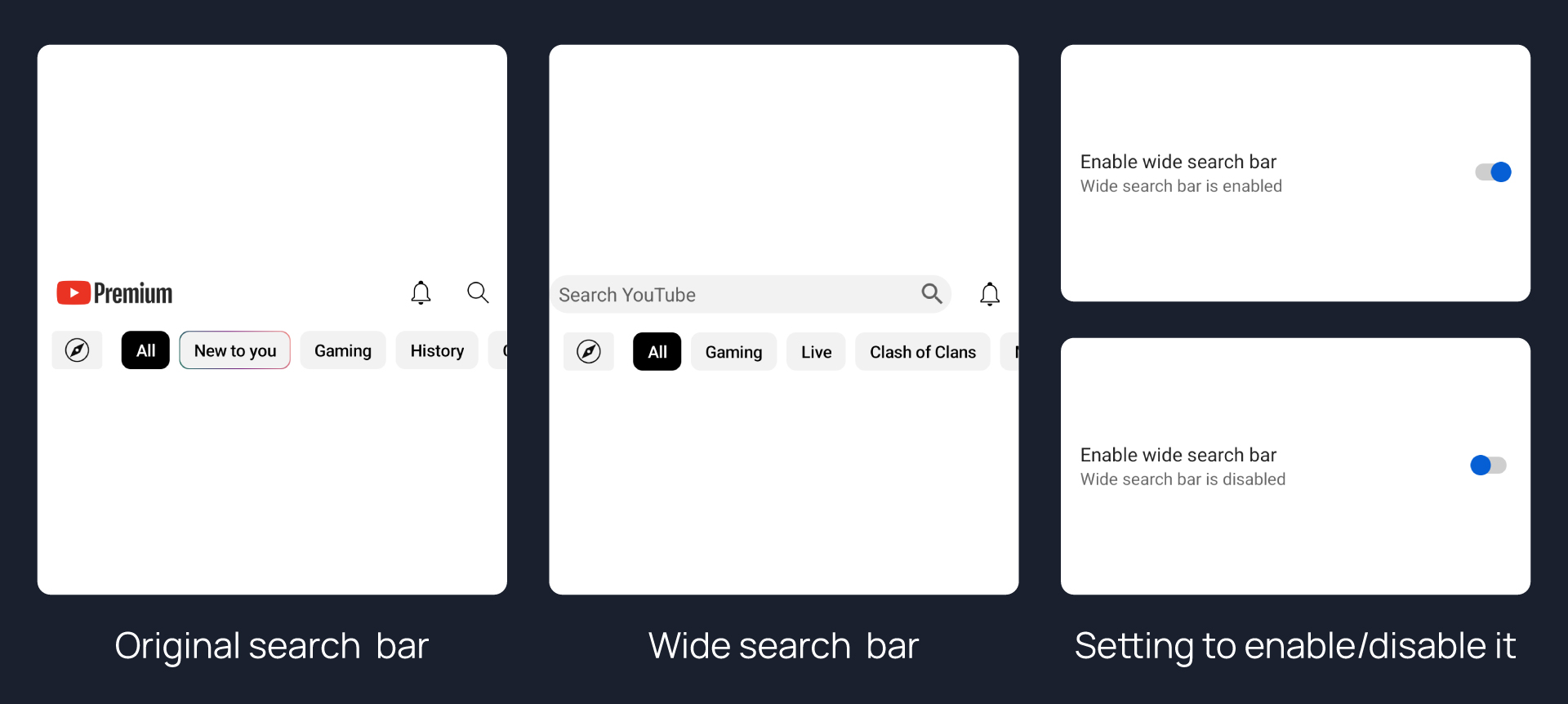 Adds an option to replace the search icon with a wide search bar. This will hide the YouTube logo when active.