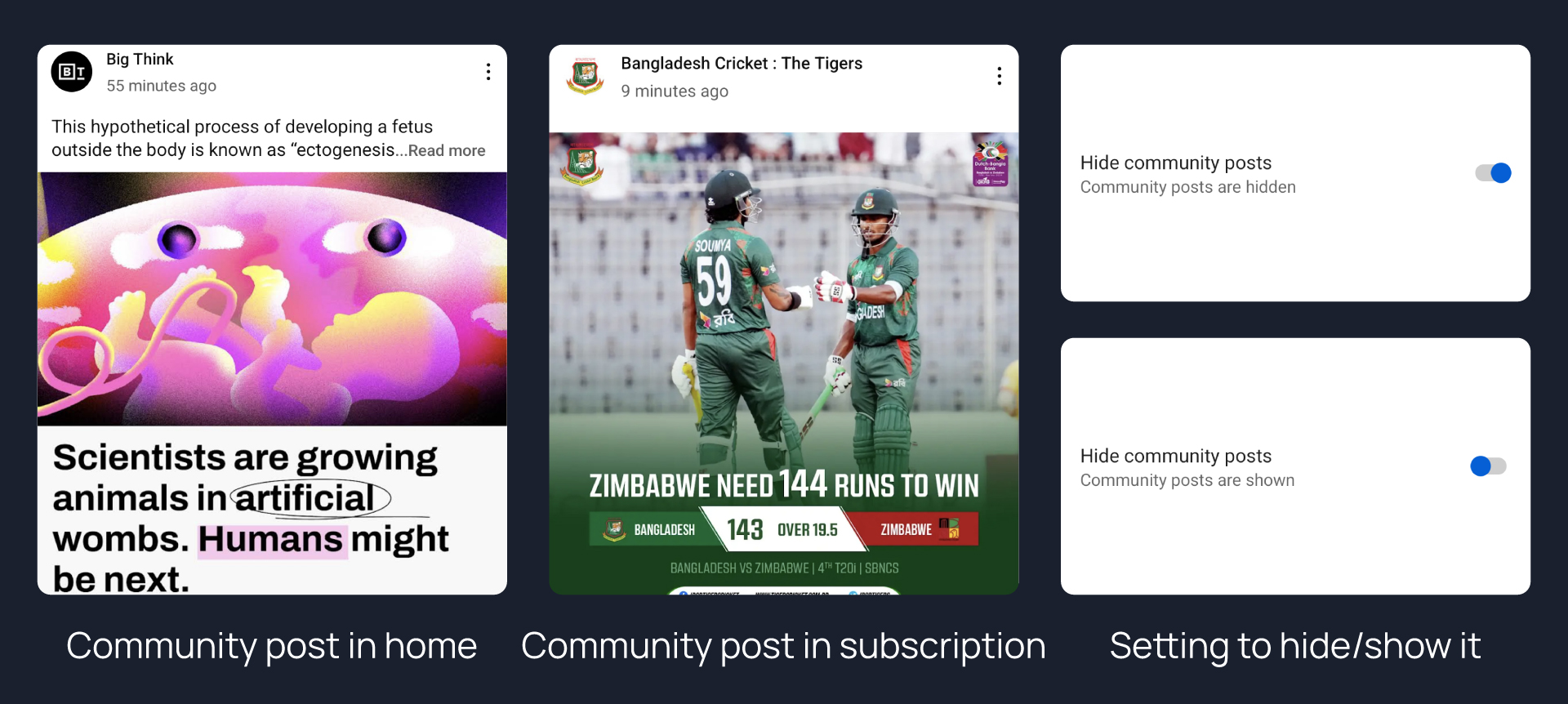 Hides community posts on the homepage tab & also from subscriptions feed.