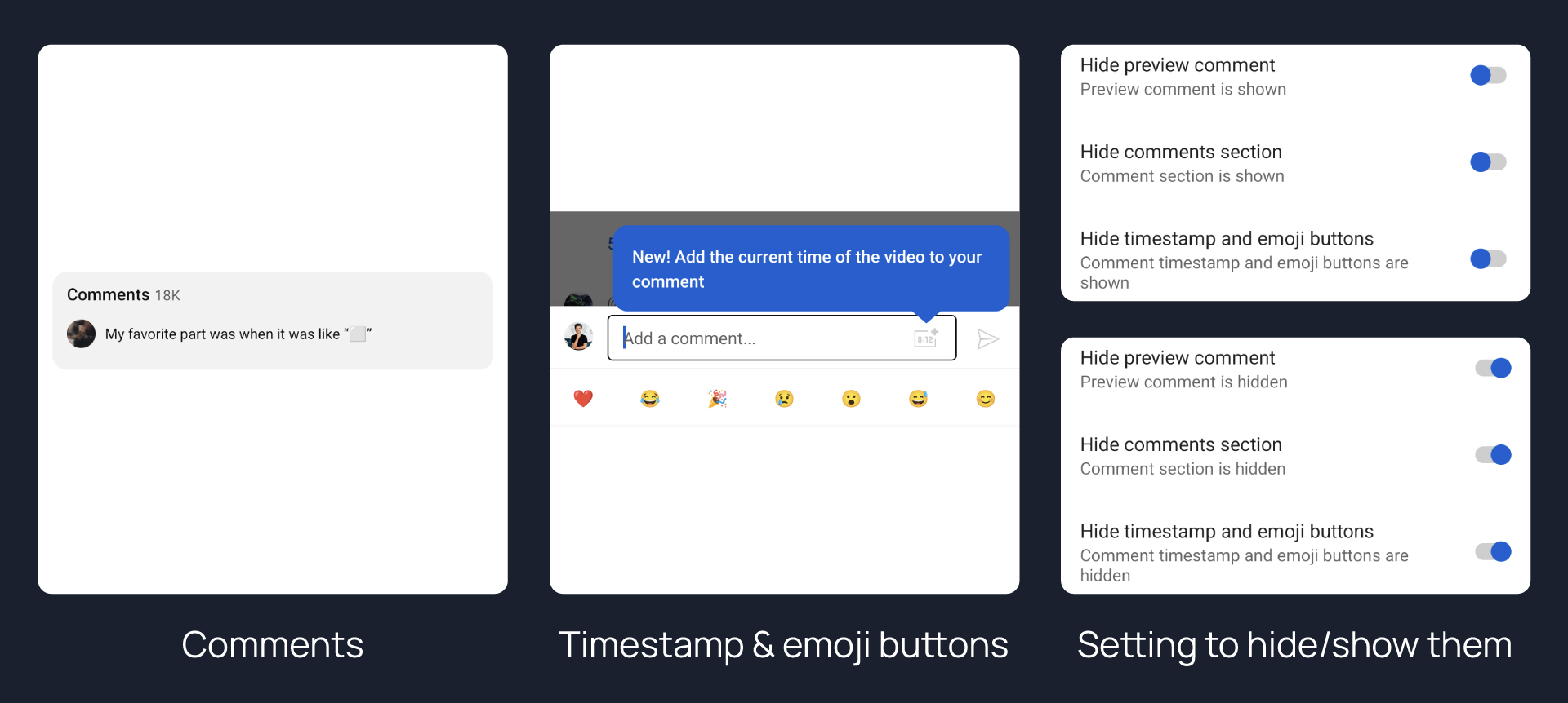 preview commentcomment sectionunder video player and to hidetimestamp and emoji buttonson comment section