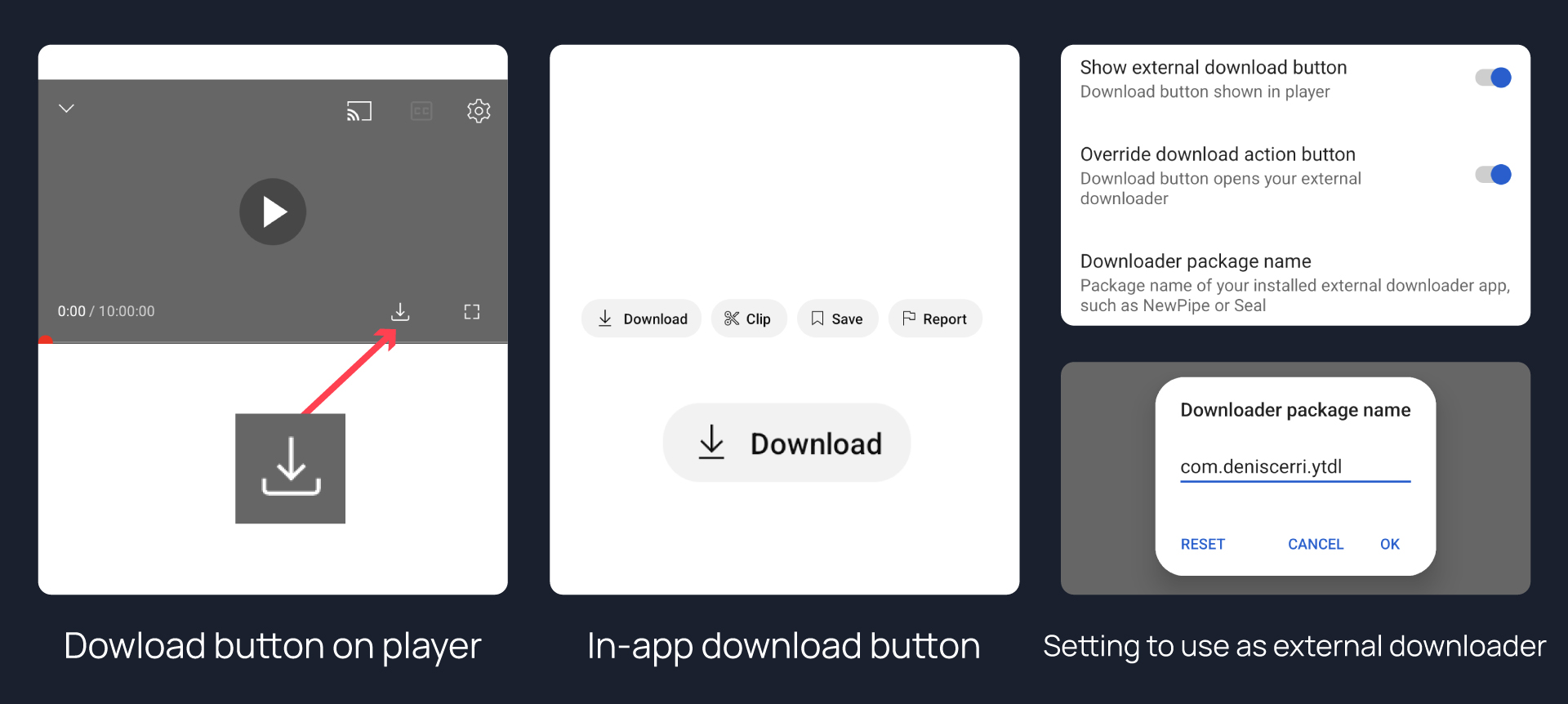 Adds support to download videos with an external downloader app using the in-app download button or a video player action button. You can choose your favourite external downlaoder by changing the downloader package name.