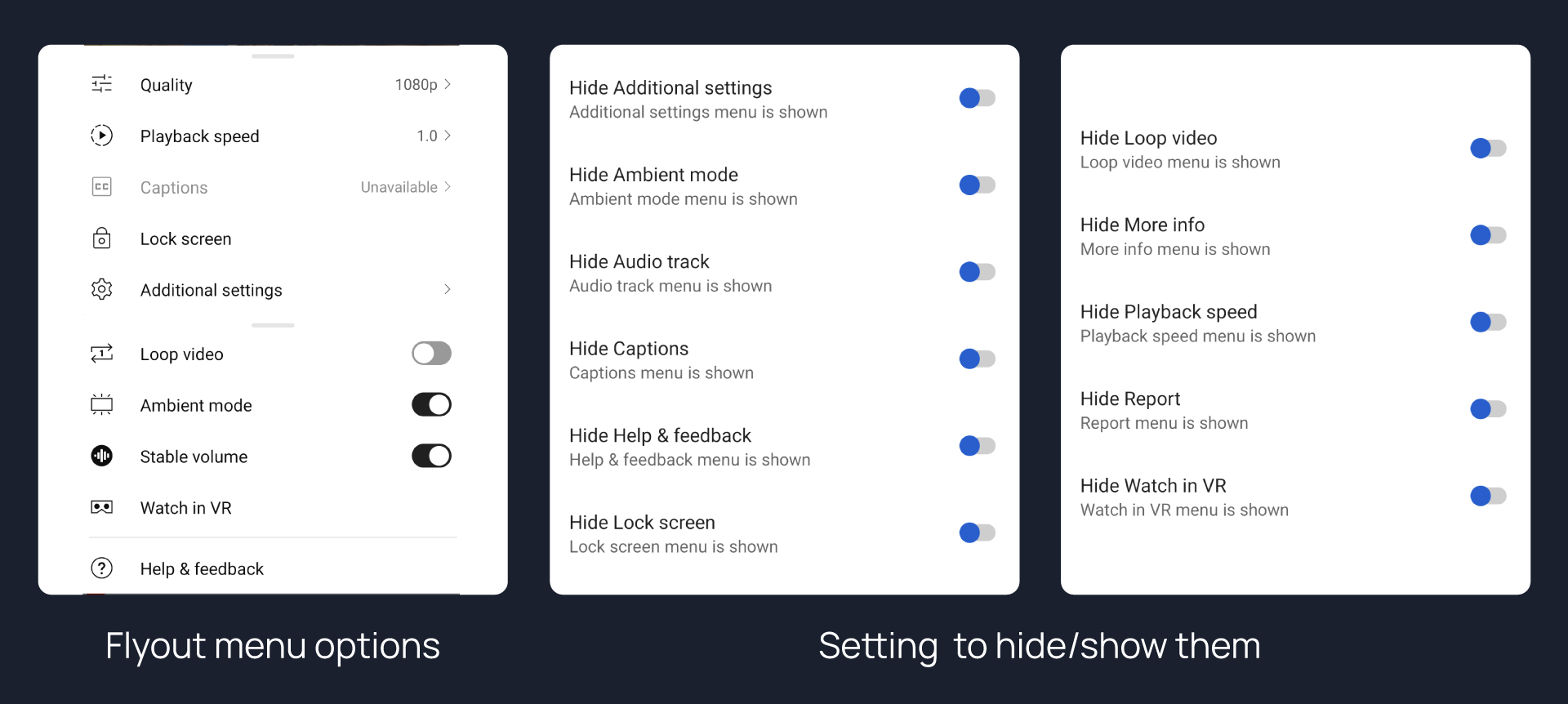 Additional SettingsAmbient modeAudio trackcaptionsHelp and feedbackLock screenLoop videoMore infoPlayback sppeedReportWatch in VRfrom video flyout menu.