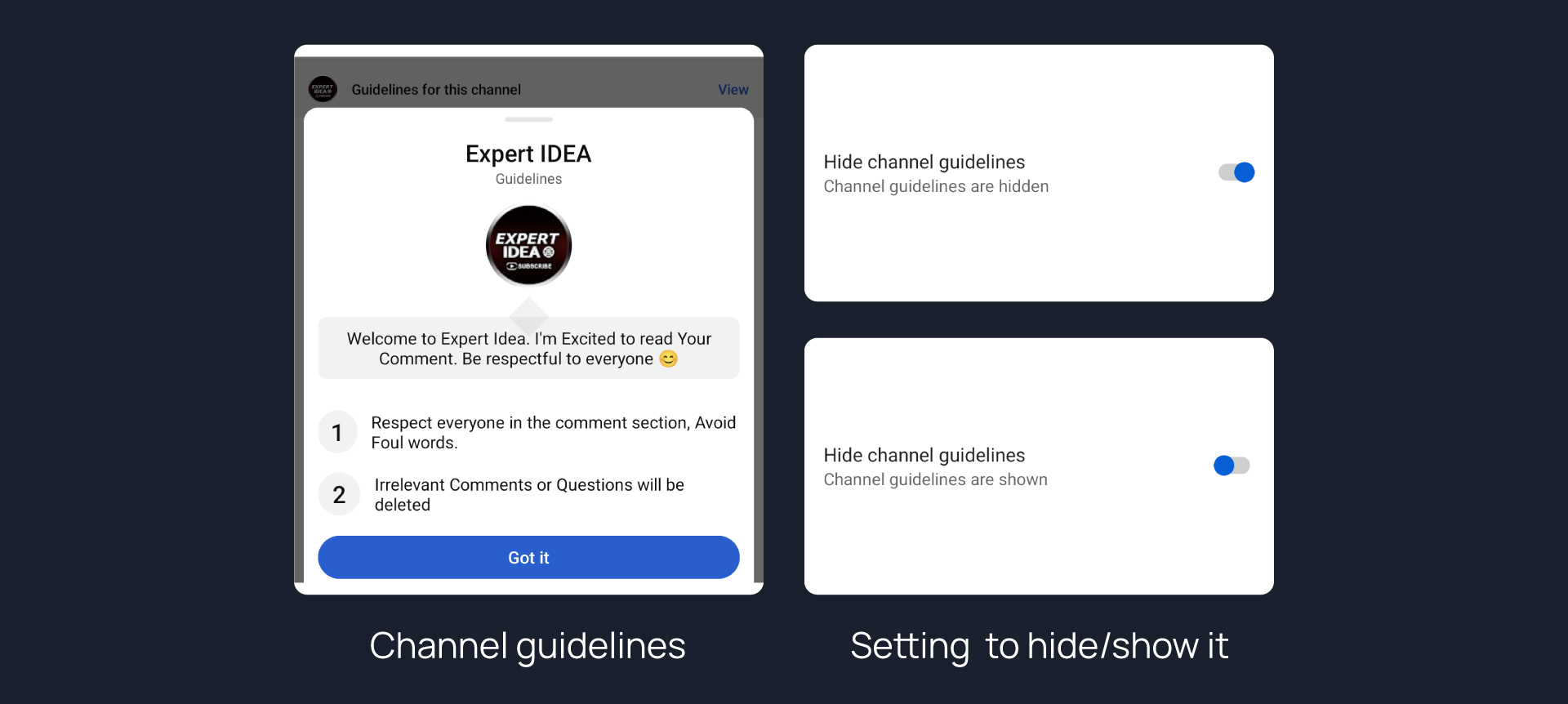 Hides channel guidelines from comments.