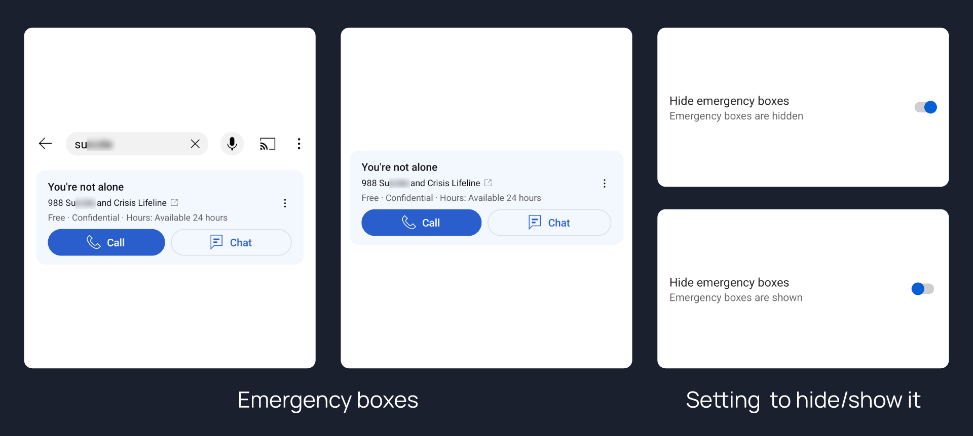 Hides emergency helpline boxes from search result and video player.