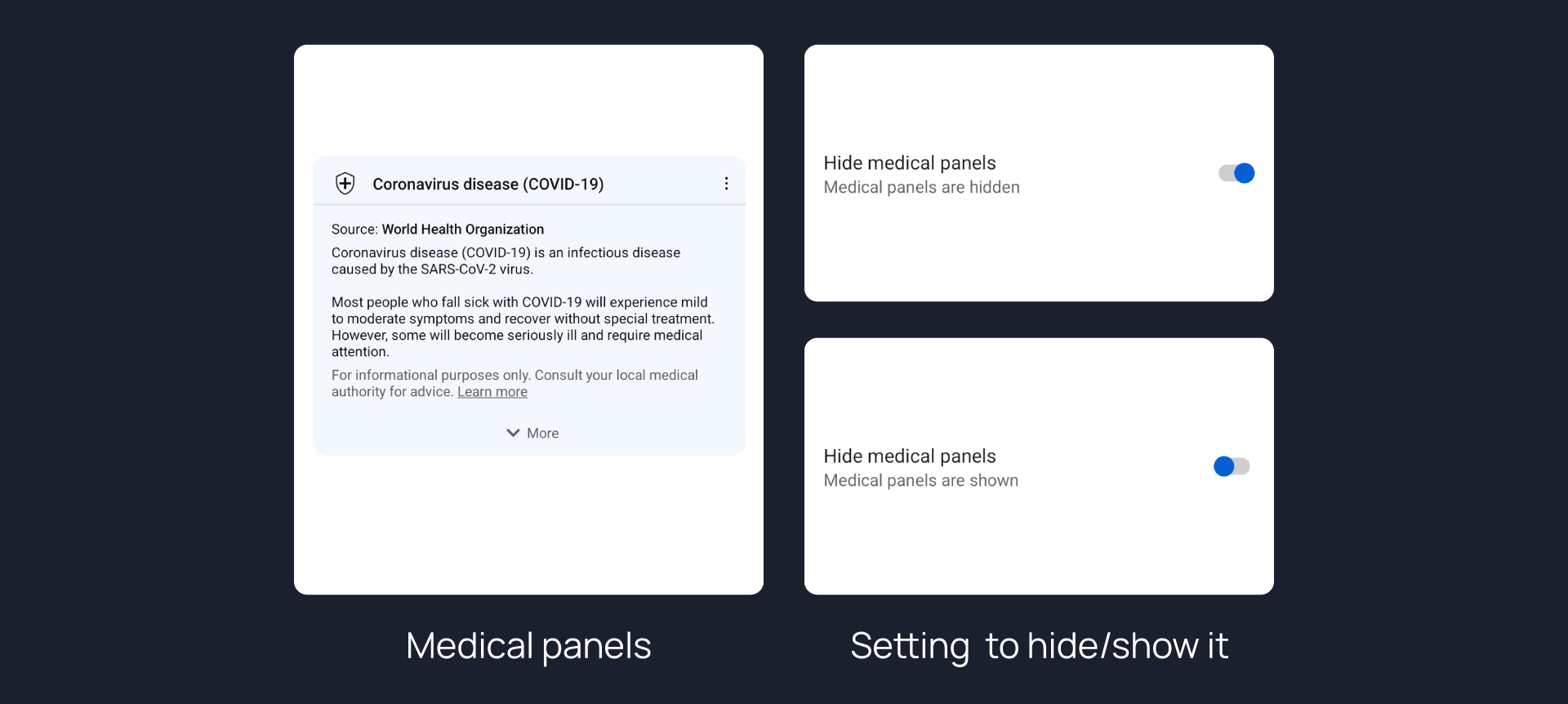 Hides medical panels from feed, search, videos.