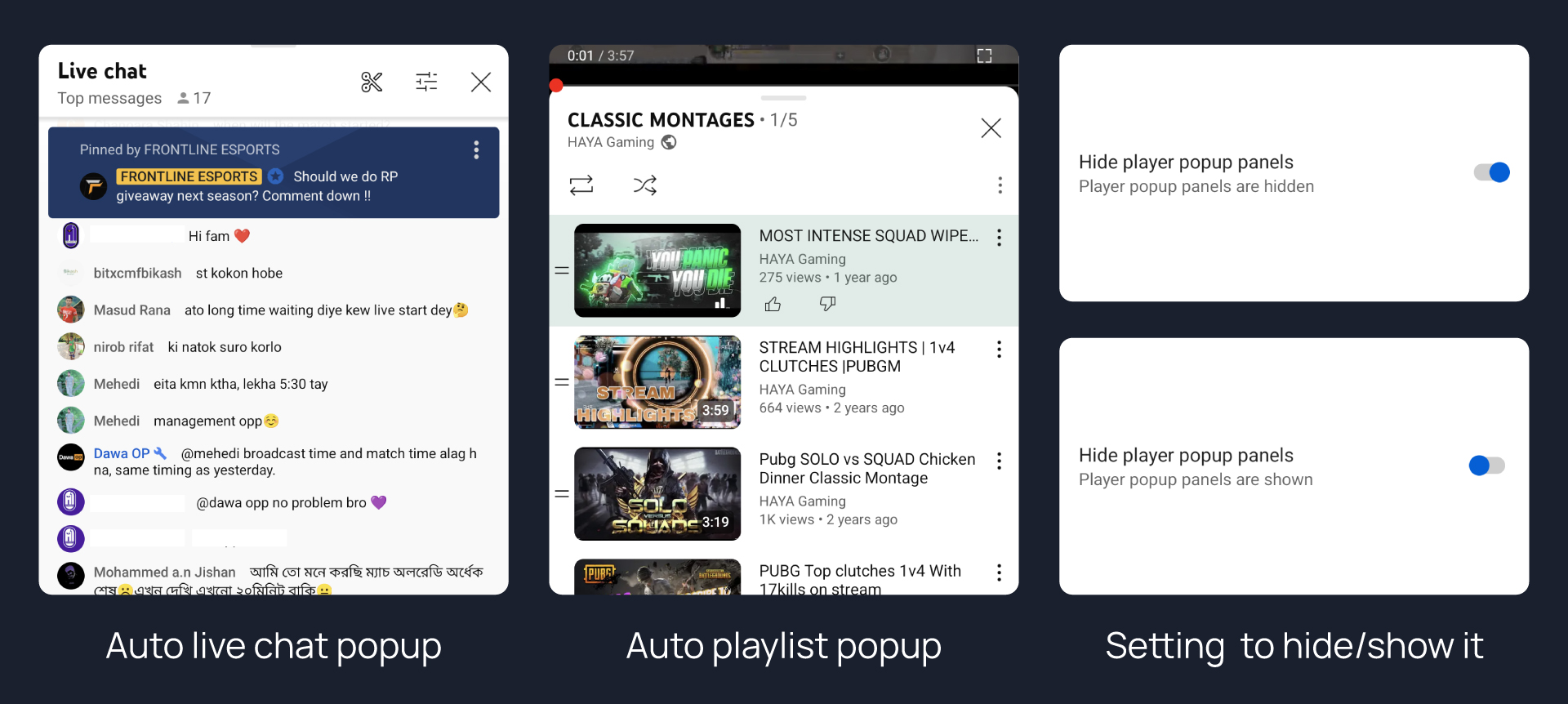 Hides automatic popup panels (playlist or live chat) on video player.