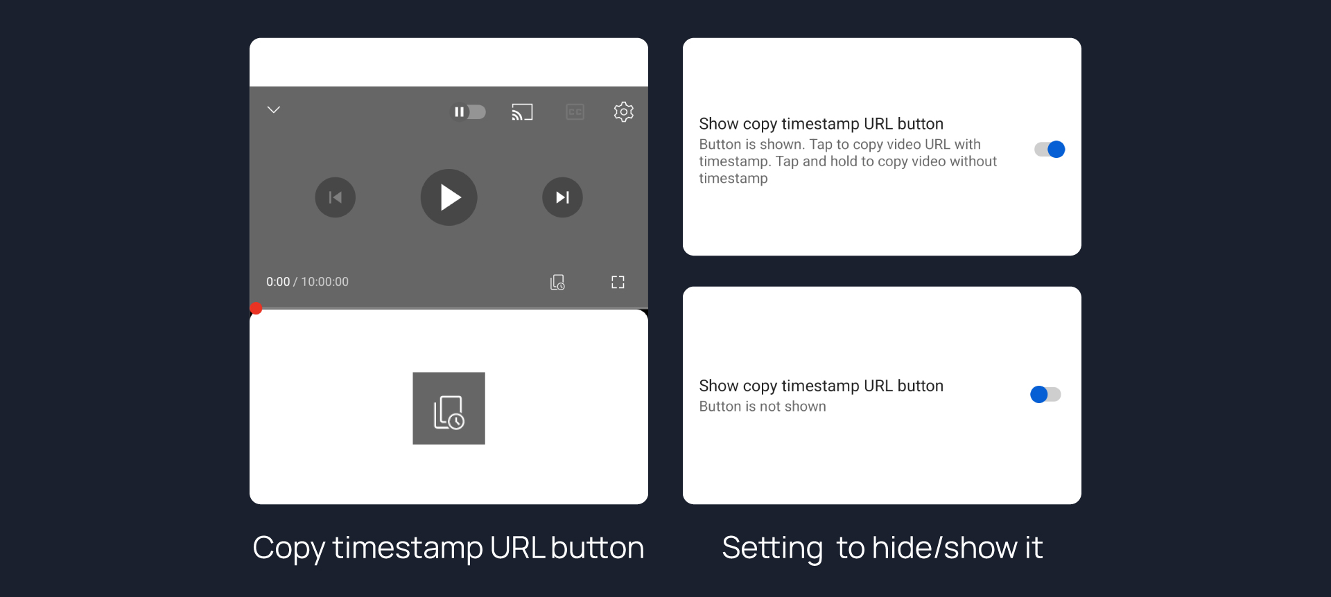 Adds a copy timestamp URL overlay button in video player action button.