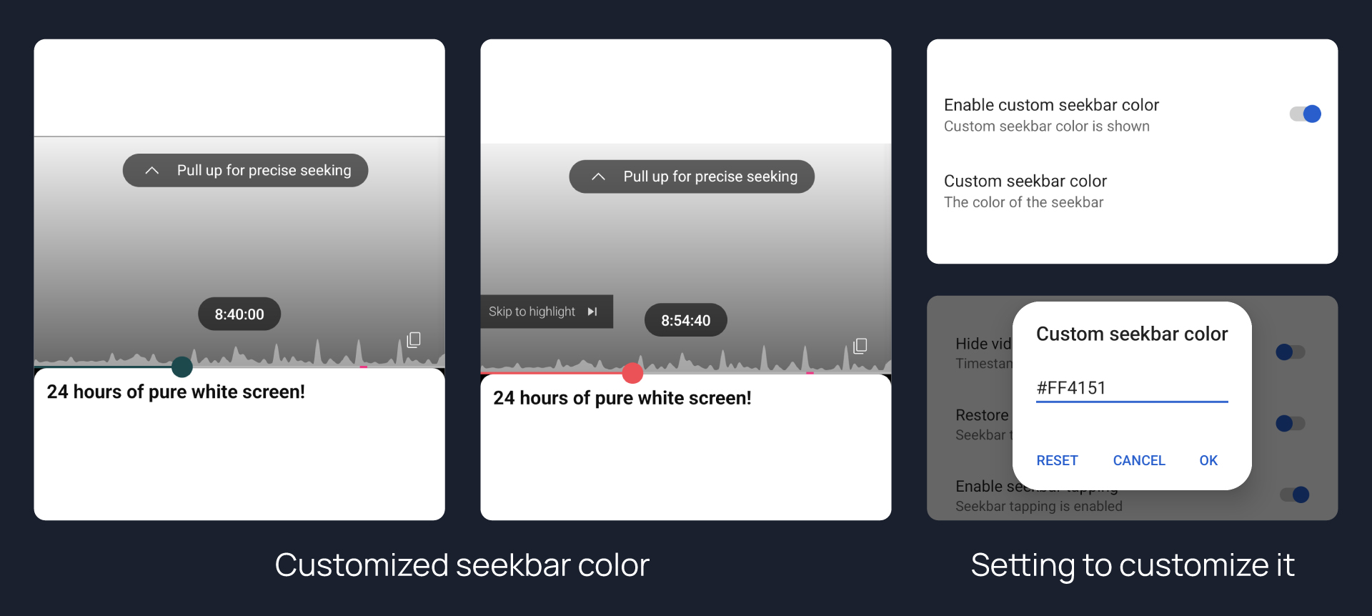 Adds an option to change dark mode gray seekbar color to any color. By default it sets into Hex Color code #FF0000 which is default YouTube red.