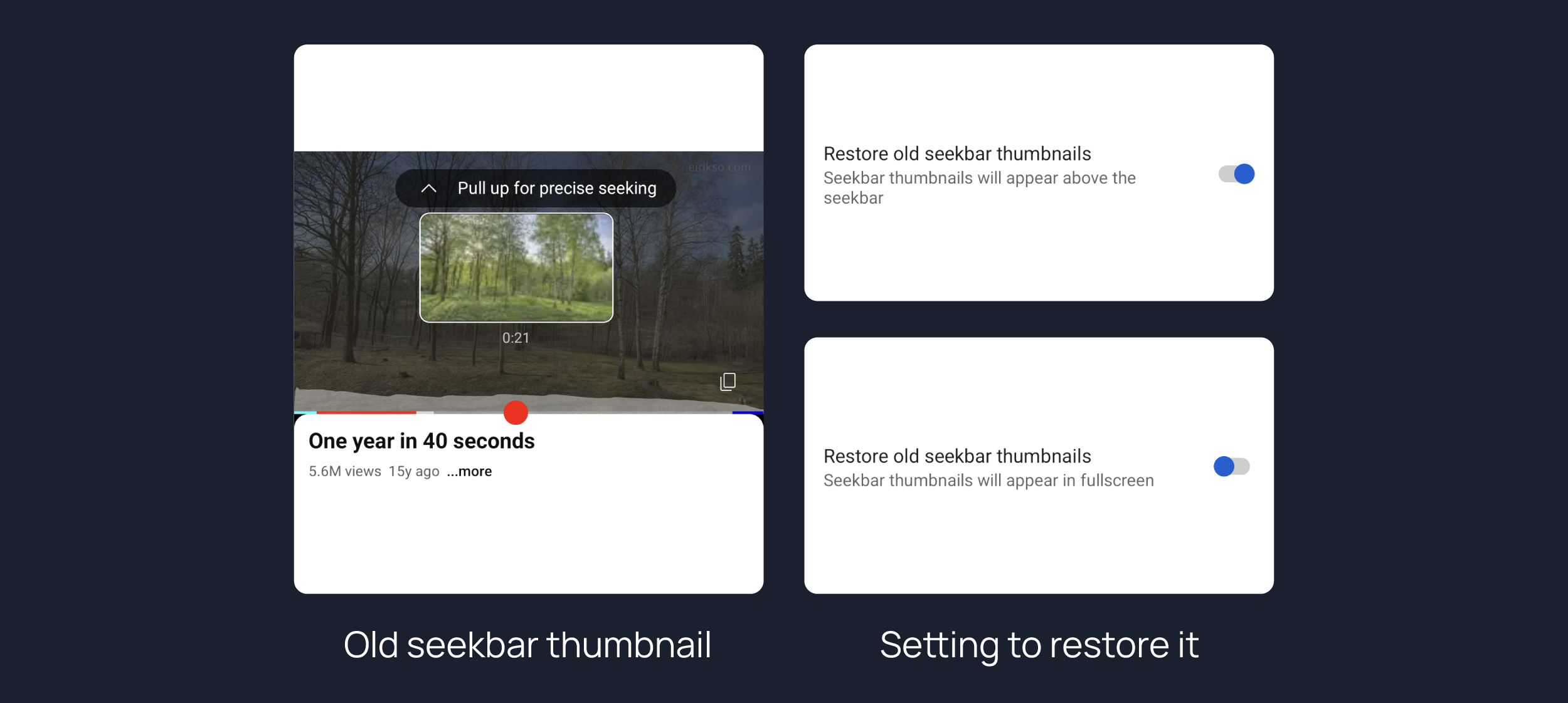 Adds an option to restore the old seekbar thumbnails that appear above the seekbar while seeking instead of fullscreen thumbnails.
