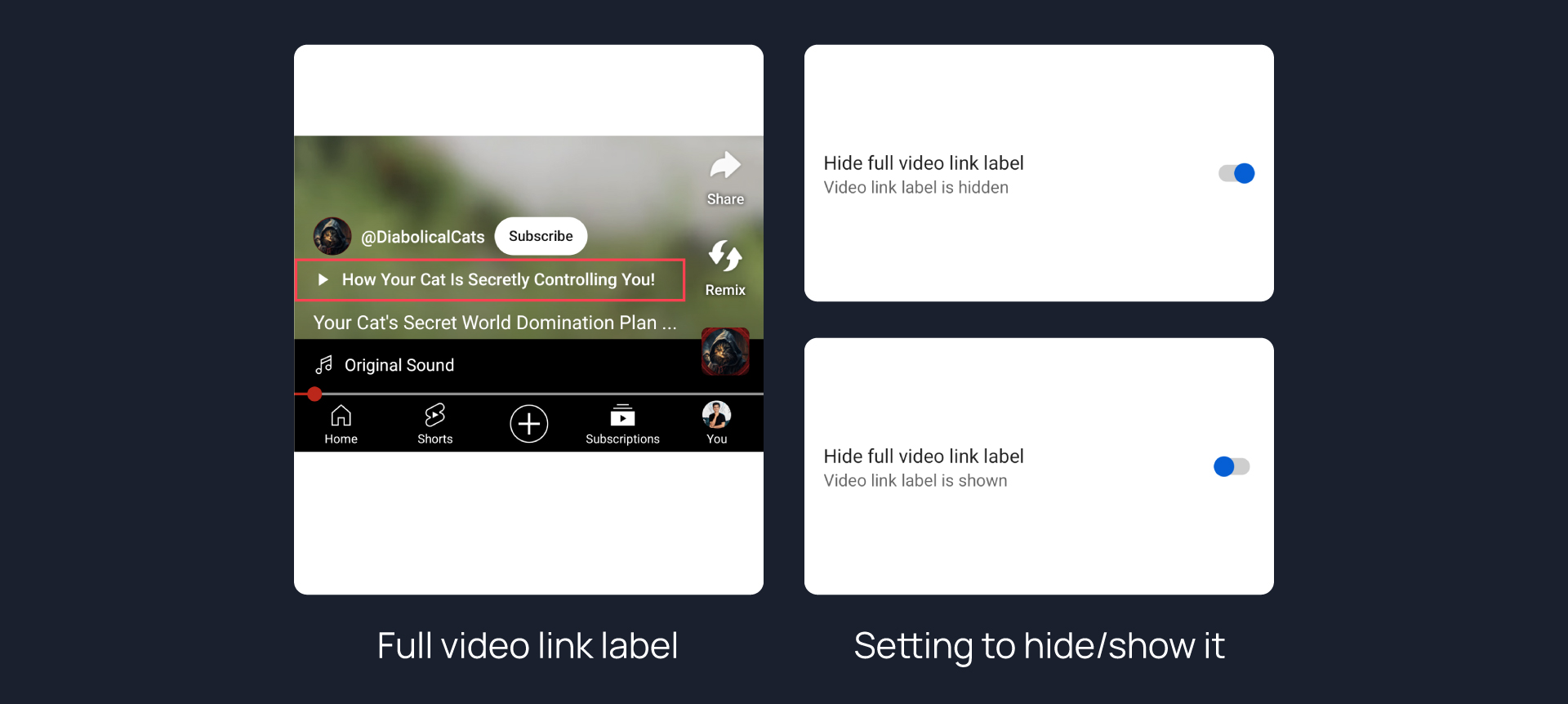 Hides full video link label from Shorts.