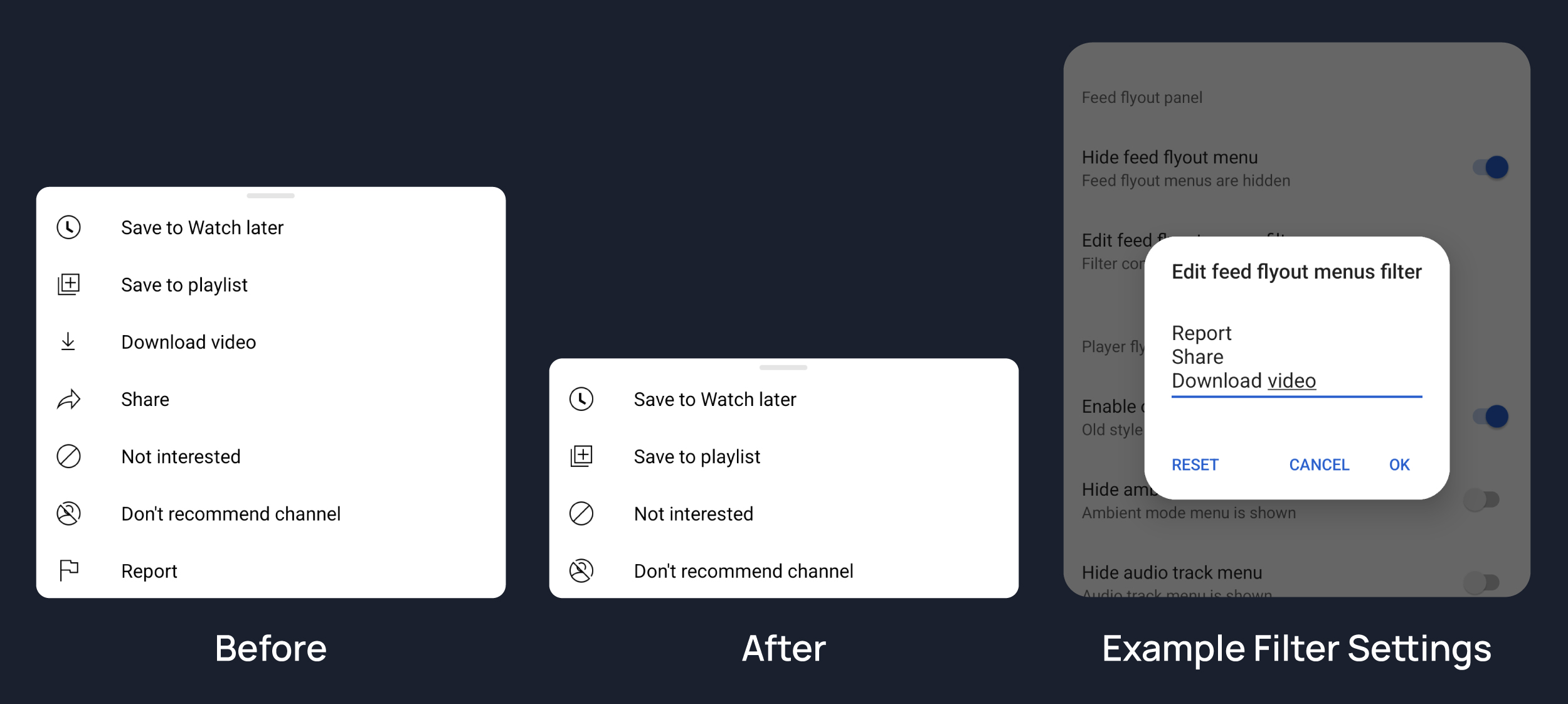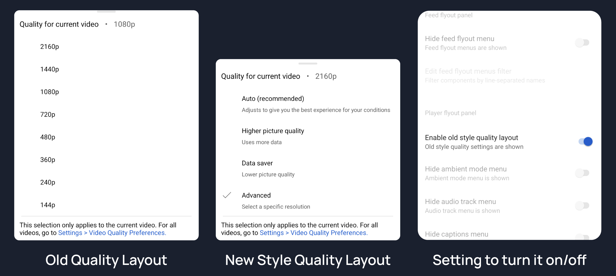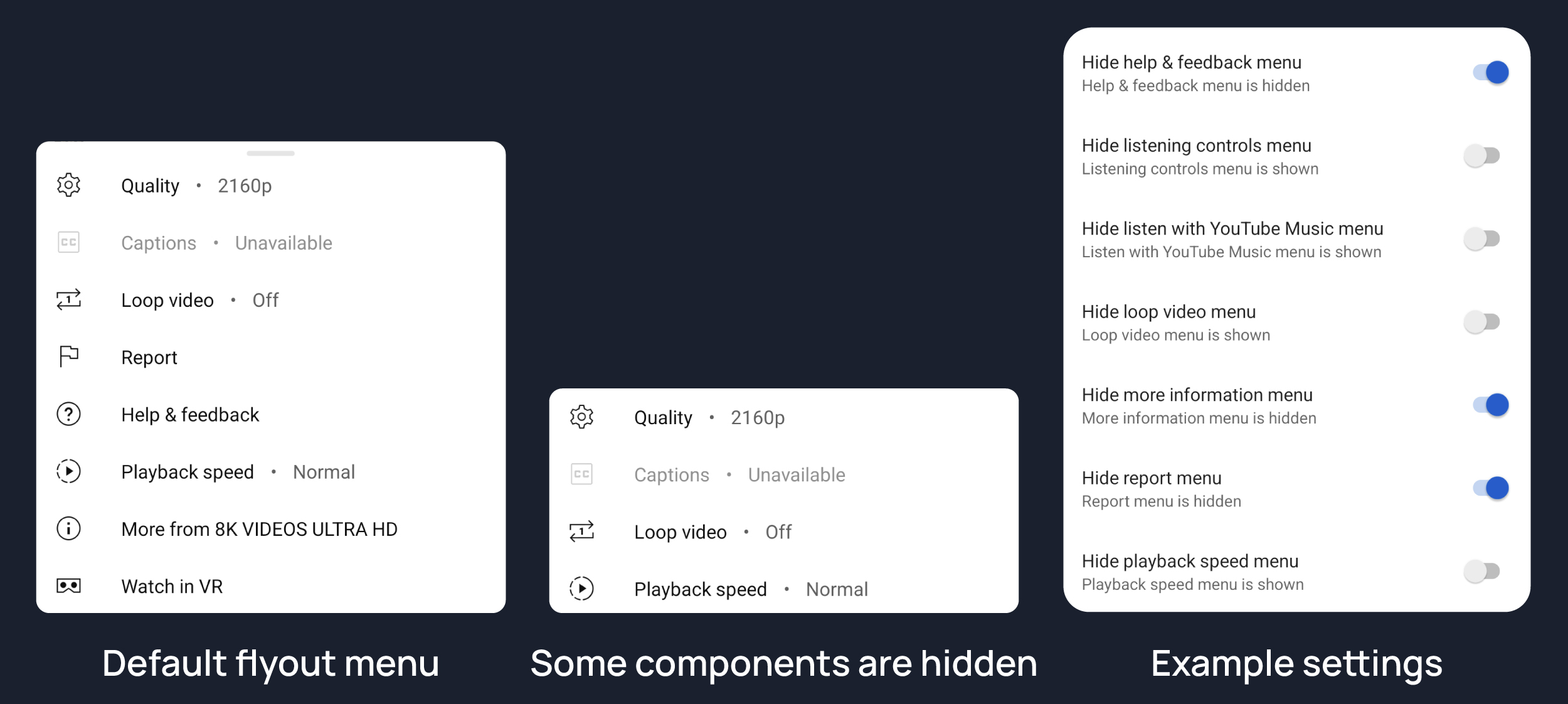 💡 You can hide Ambient mode, Audio track, Captions, Captions menu footer, Help & Feedback, Listen with YouTube Music, Lock screen menu, Loop video, More information, Playback speed, Premium controls, Quality menu footer, Report, Stable volume, Stats for nerds, Watch in VR menu separately