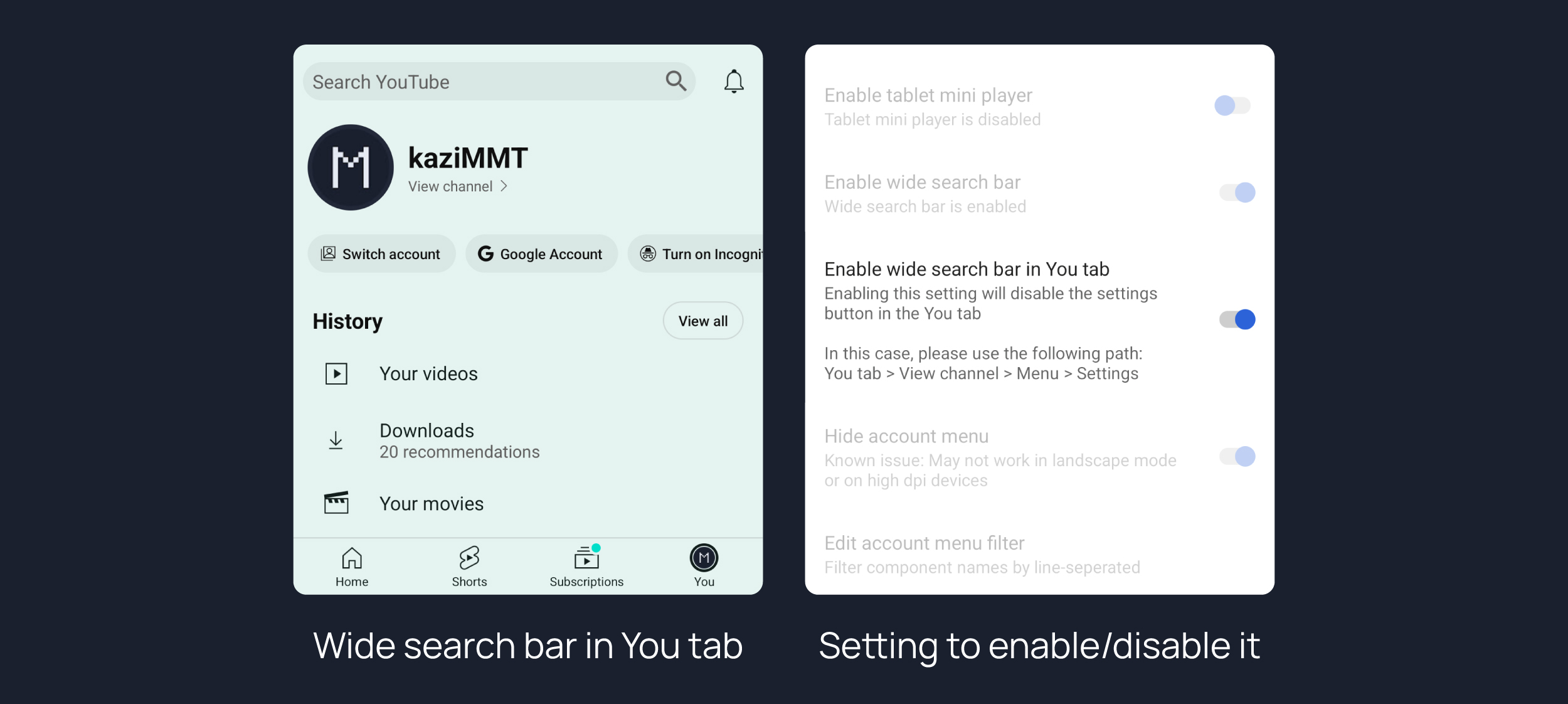 Replaces the Notification bell icon, search icon & gear icon with wide search bar in You tab