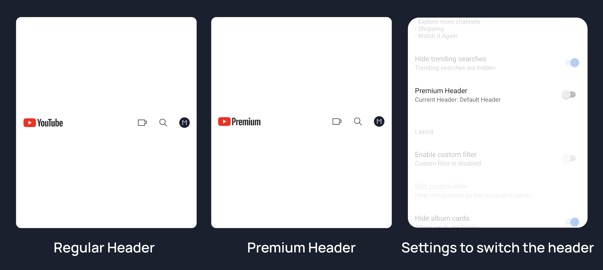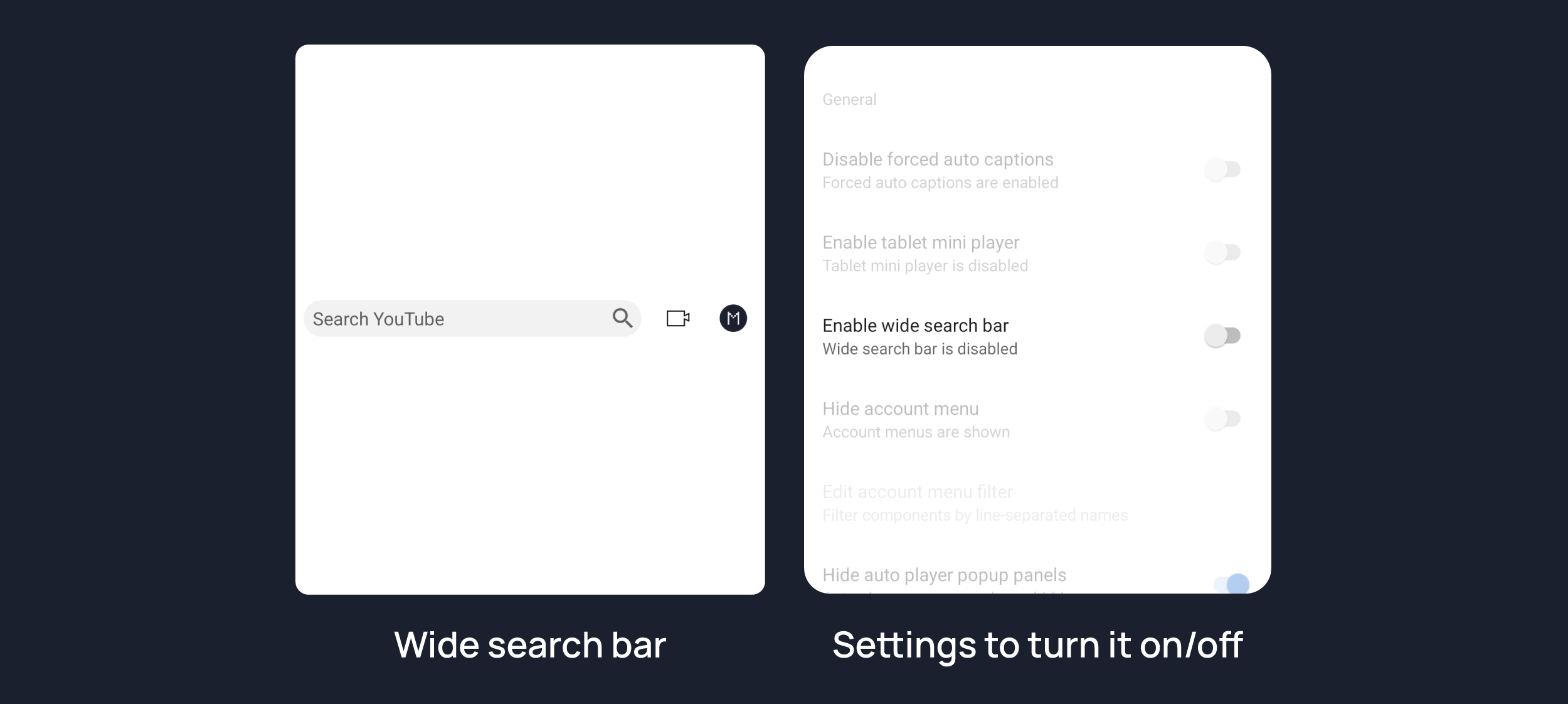 Replaces the search icon with a wide search bar. This will hide the YouTube logo when active.