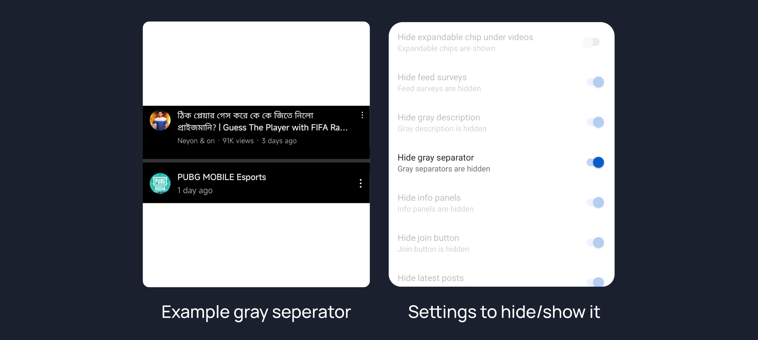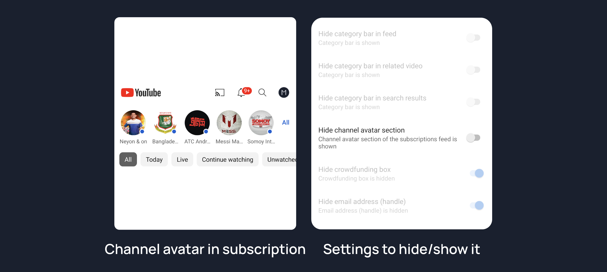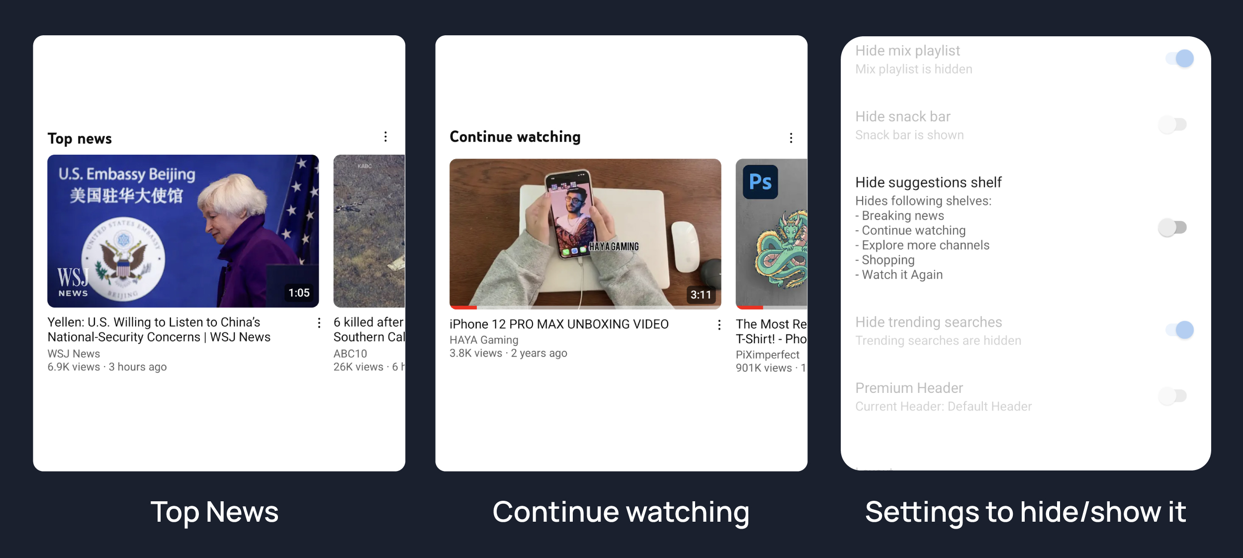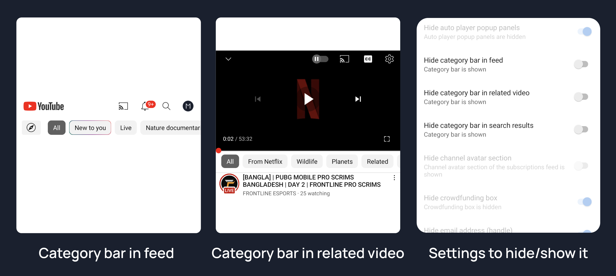 💡 You can hide Category bar in feed, Category bar in related videos, Category bar in search results separately