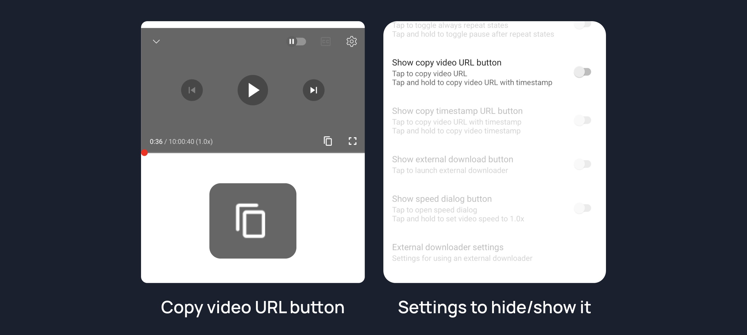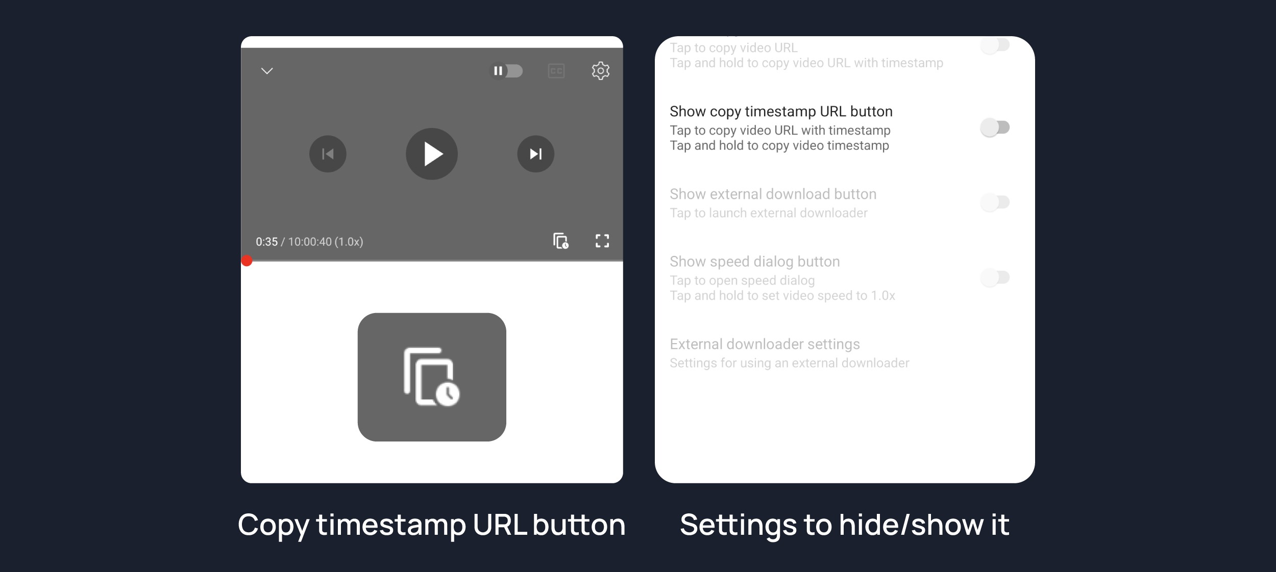 Shows copy timestamp url button on player. You can copy video link with current timestamp directly by pressing this button.