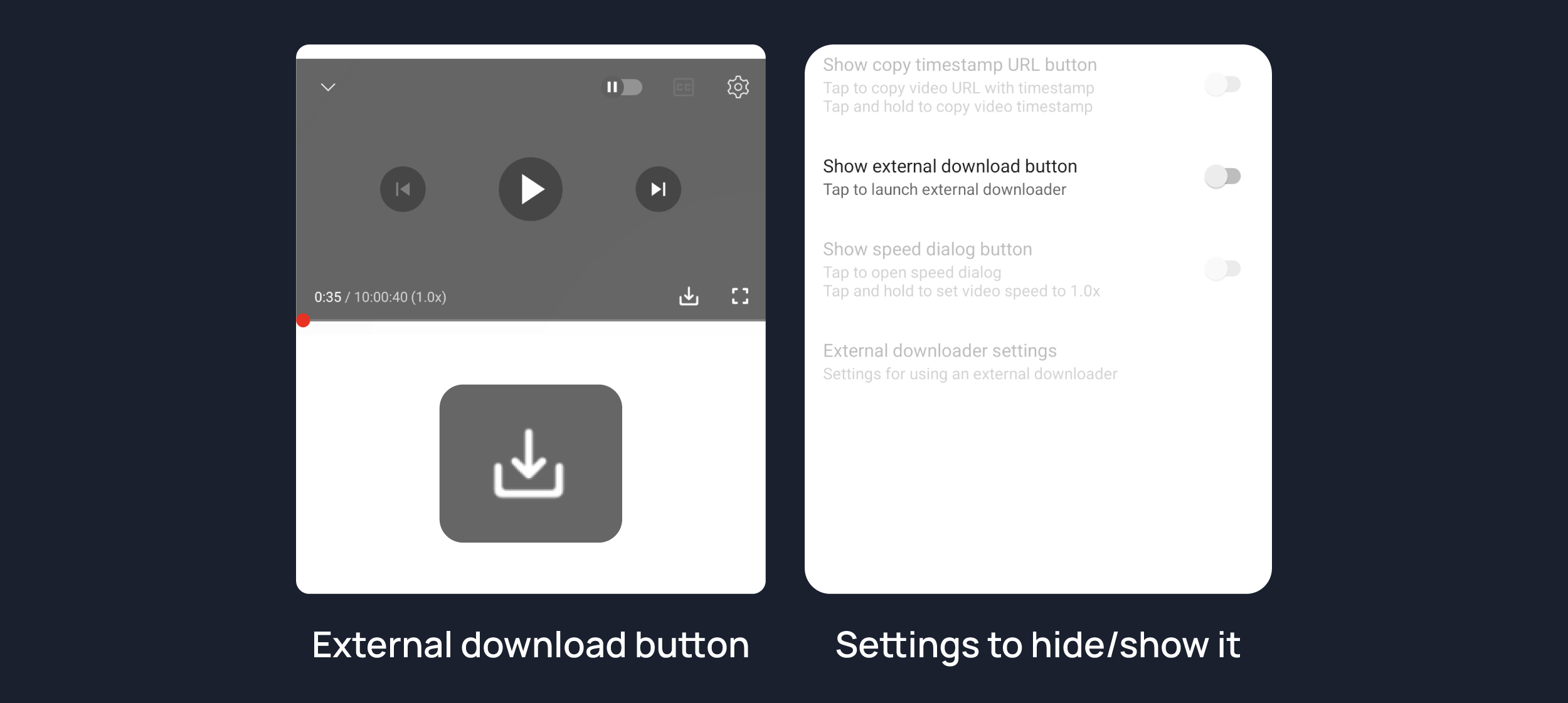Configure external download button with your favourite downloader app.