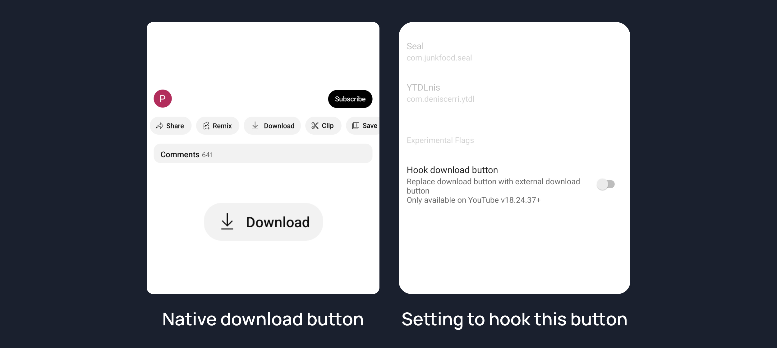 Hook native download button as external download button. Then native download button also work as a external downloader button.
