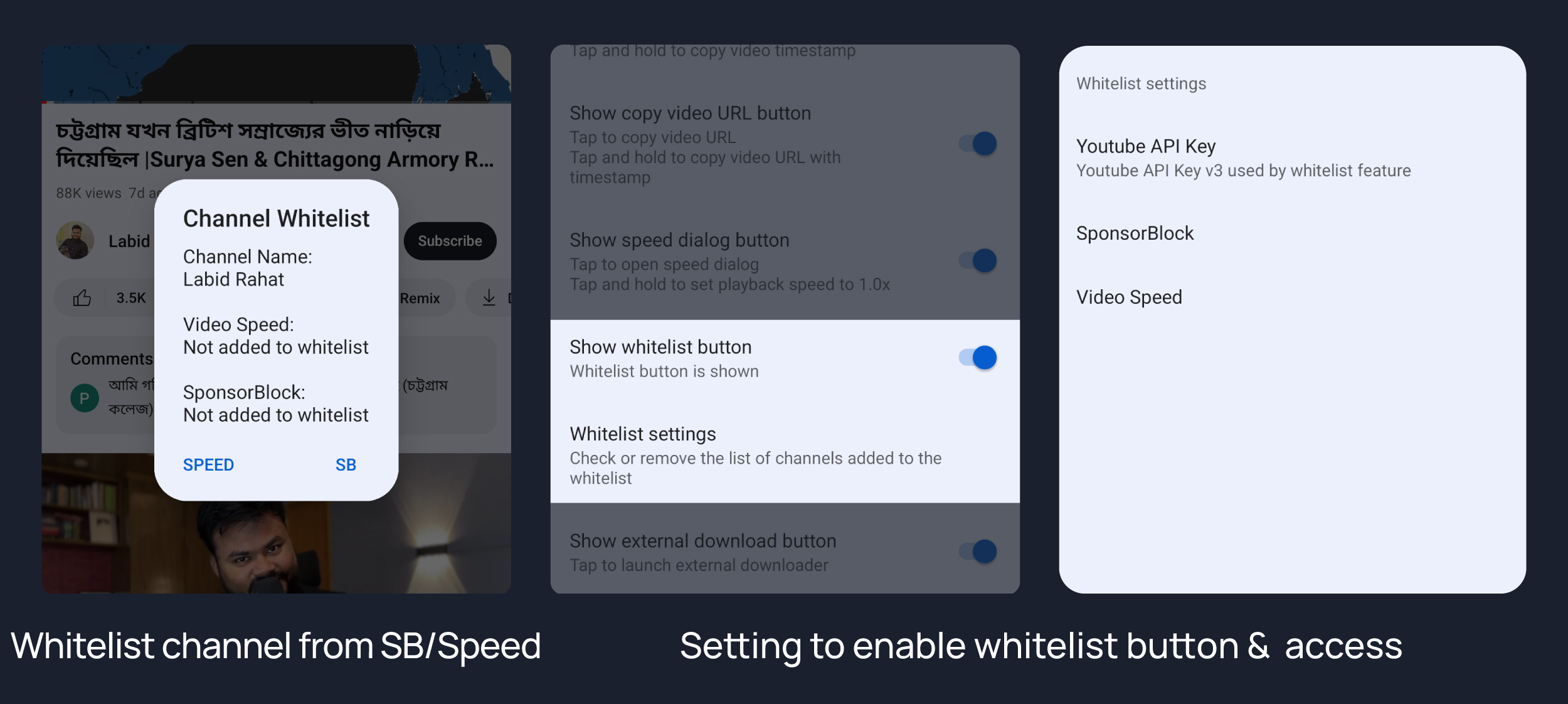 Shows whitelist button on player. Which allows yout to whitelist any channel from SponsorBlock & Default playback speed.