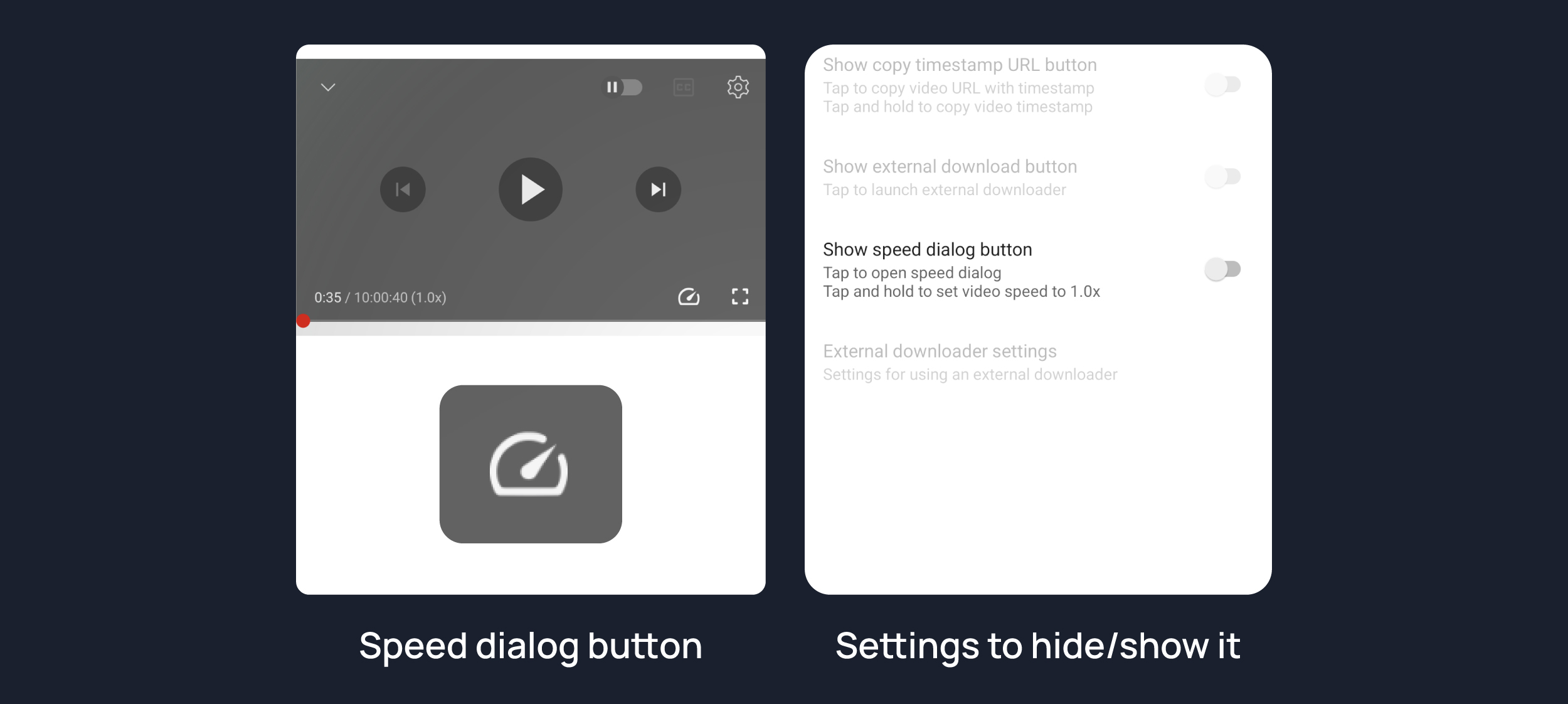Shows speed dialog button on player. You can change/reset video speed using this button.